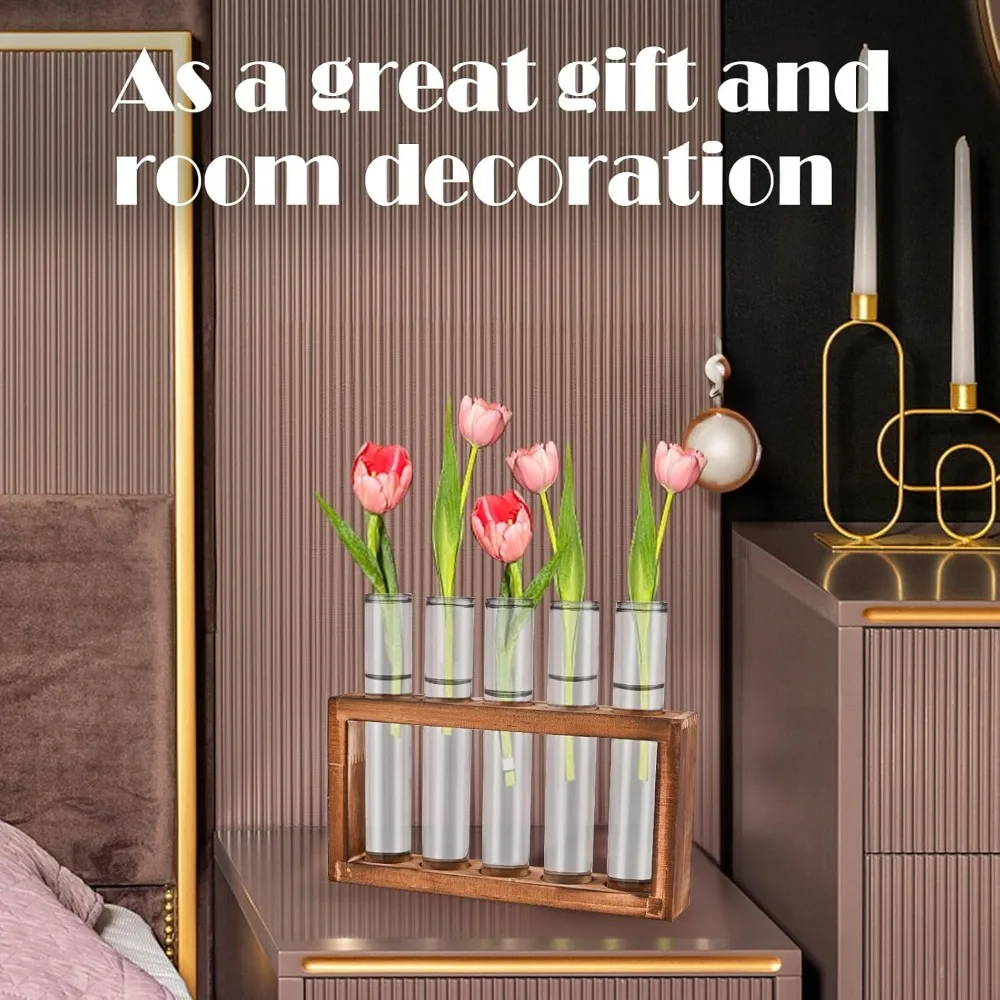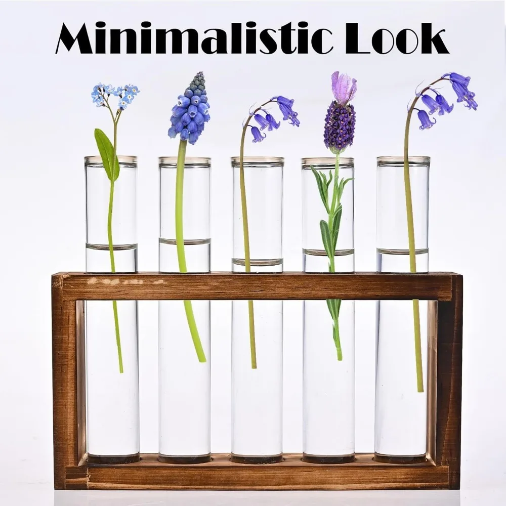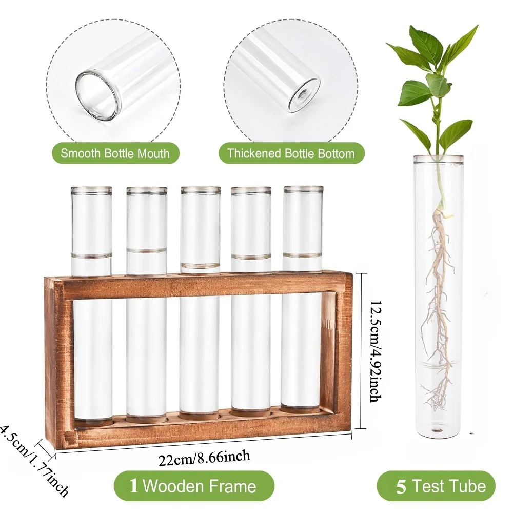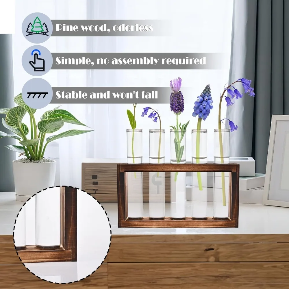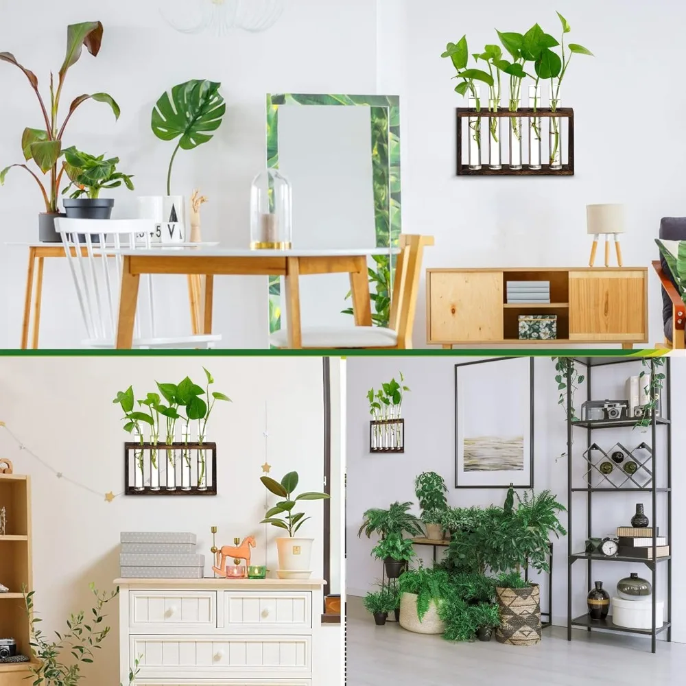 3/5 Tubes Wall Hanging Hydroponic Plant Propagation Glass Vase with Wooden Stand Desktop for Home Office Planter Garde Decor