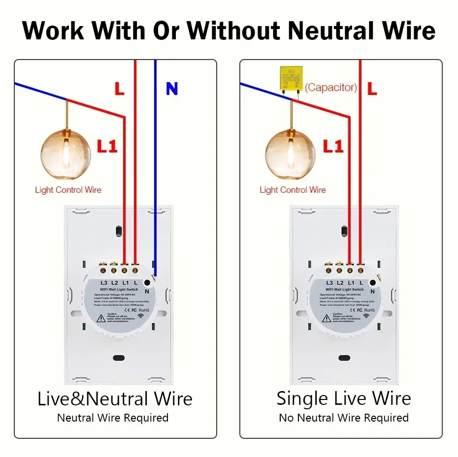 1)This switch can be work at both of without Neutral wire and with neutral wire,perfectly compatible with these two wiring methods.If your House wiring is without neutral Wire, A capacitance is a must to be connected to both ends of the L1 bulbs for normal work.